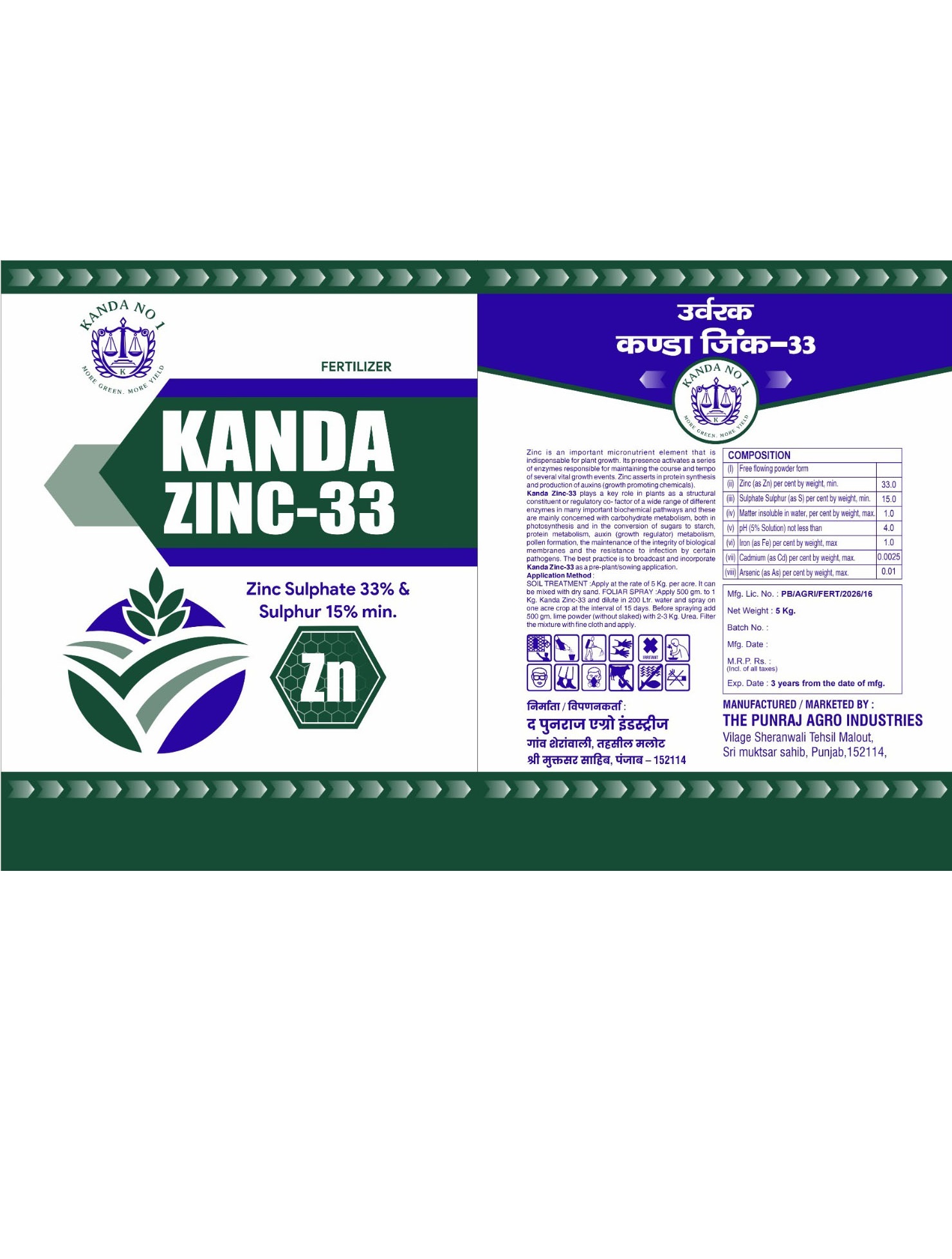 SOIL TREATMENT: Apply at the rate of 5kg. per acre. It can be mixed with dry sand. FOLIAR SPRAY : Apply 500gm to 1kg Kanda Zinc-33 and dilute in 200 Ltr. water and spray on one acre crop at the interval of 15days. Before spraying add 500gm lime powder (without slaked) with 2-3 Kg. Urea. Filter the mixture with fine cloth and apply.